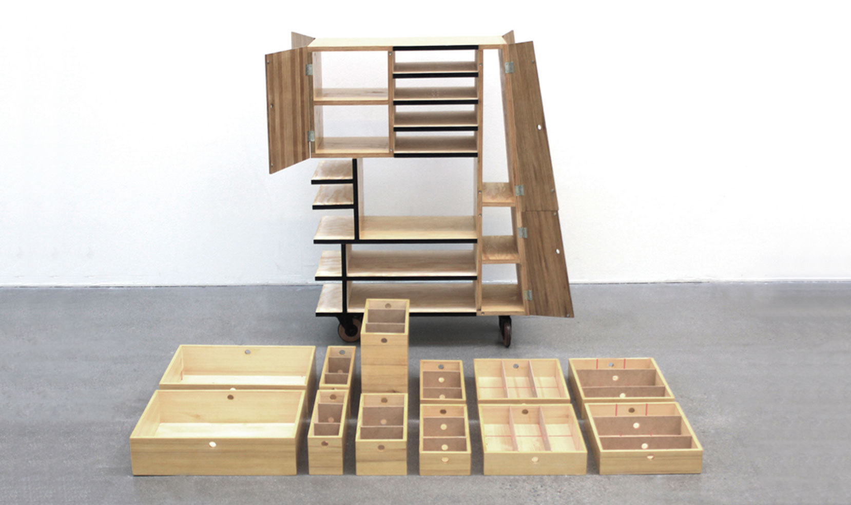 Seduced by this principle, we imagined Andy, a small flying piece of furniture for office spaces. Its cupboards open on both sides, the drawers also. The assembly is mounted on wheels and, because of its small dimensions, it can be a perfect companion of office, keeping close to workers all the tools and supplies that are necessary to them.