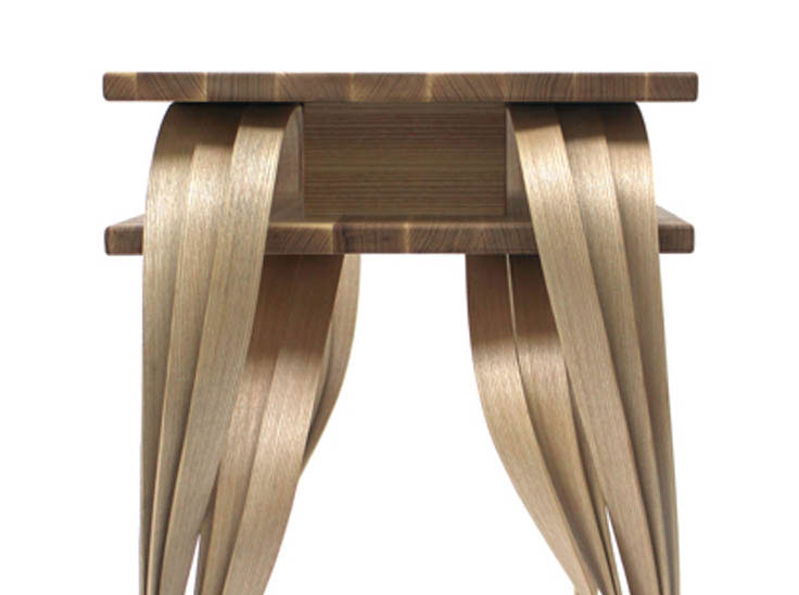 Rhopalie is the result of a multitude of experiments around the technique of wood bending in an oven. After testing different species of wood, different types of bends or twists, broke a good number of pieces of wood ... one of these tests caught our attention. It has become, once multiplied, the legs of this table.